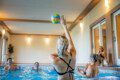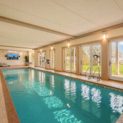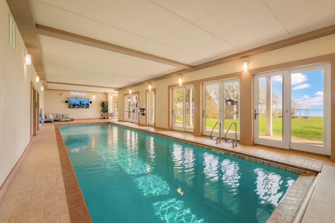 Indoor Pool Paradise: 45-ft heated pool, lounge seating, and an 85″ TV so you can swim and stream.