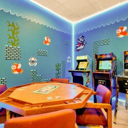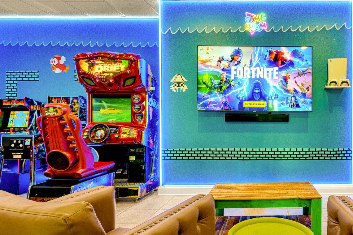 Arcade Heaven: PS5, Fast & Furious driving sim, pinball, foosball, and card table.