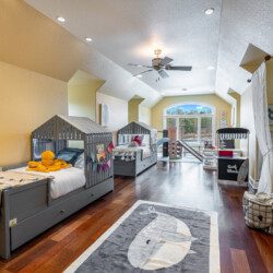 Bedroom 6 – Kids’ Playroom: Two trundle fort beds (4 twins), slides, toys, and a surf-shack play zone — “🧸 our kids were entertained for hours while we finally relaxed.”