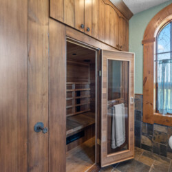 🛁 Main floor spa bathroom with dual showers, soaking tub, and sauna