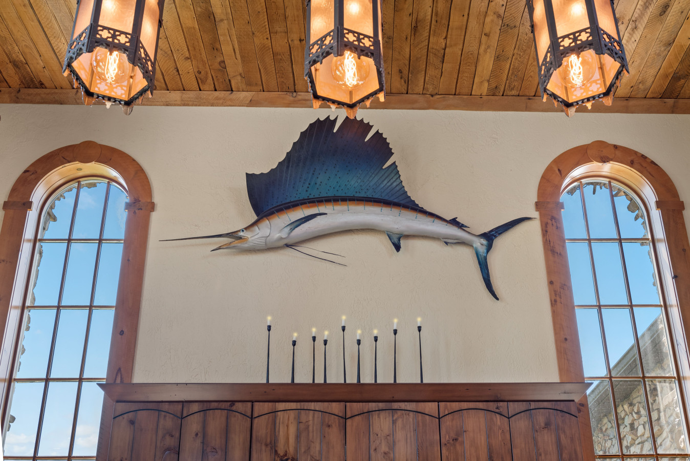 🪵 Stainless steel island beneath repurposed church chandeliers