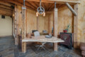 🚋 Antique hay trolley lighting above the dining table