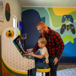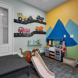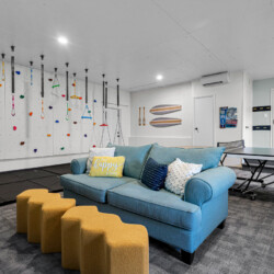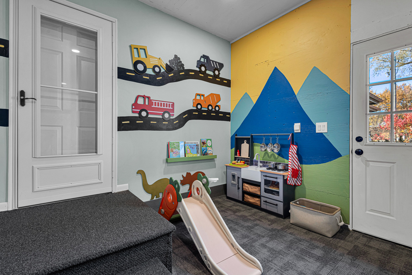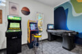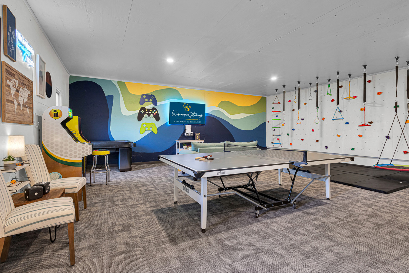 • Game garage with Ninja Warrior ropes course, rock wall, toddler zone, PlayStation 5, and arcades 🎮