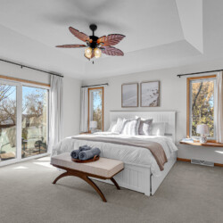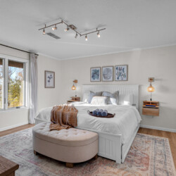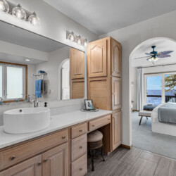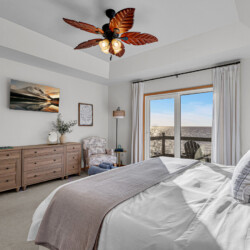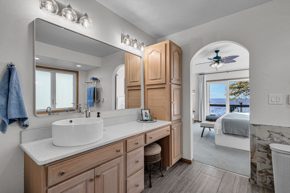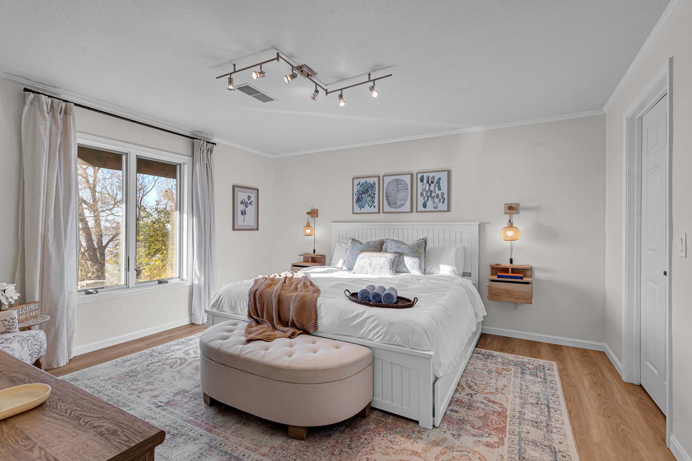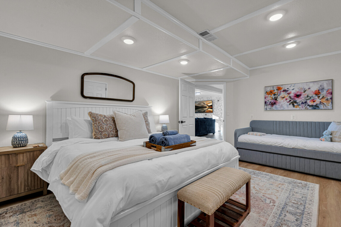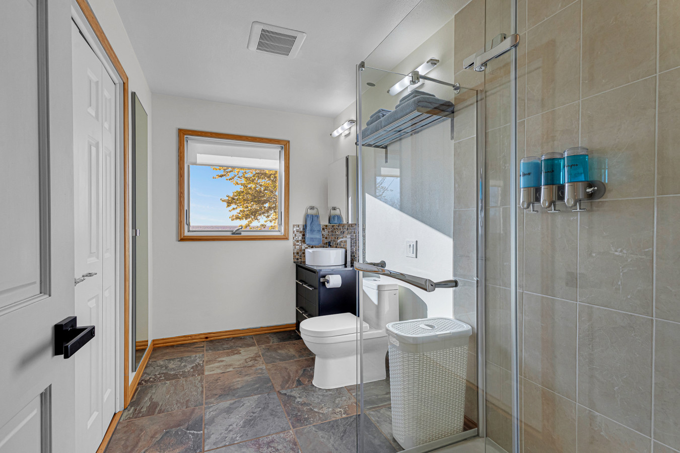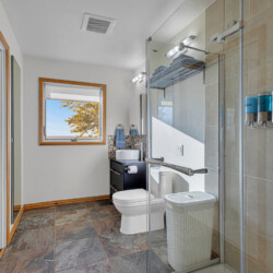 • Bedroom 2: Queen bed + desk, adjacent full bath