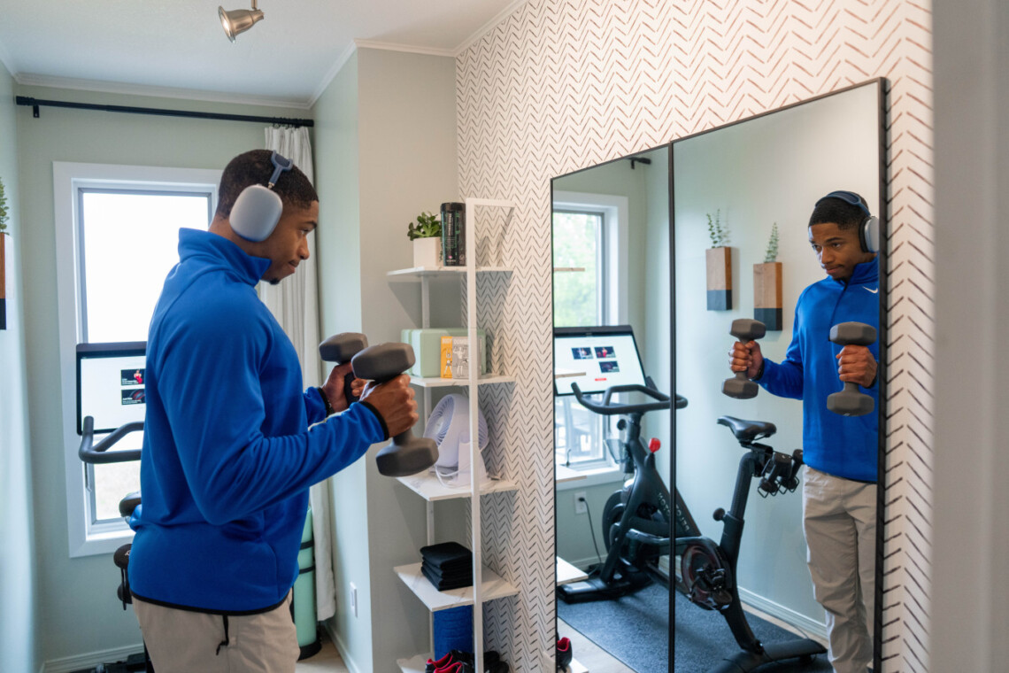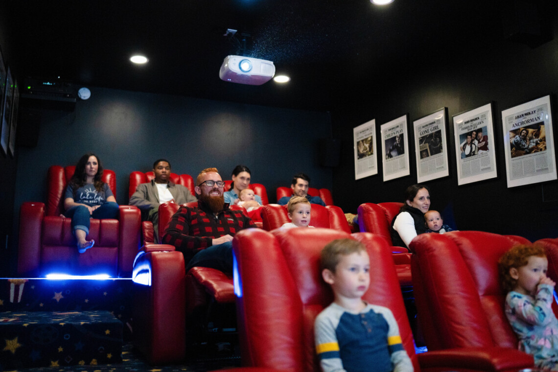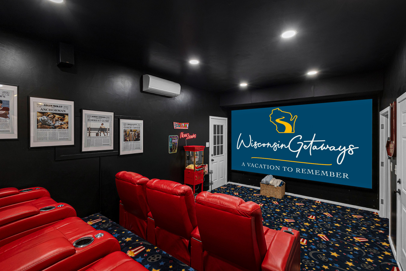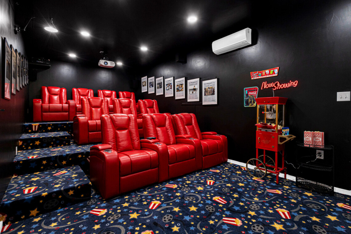 • Private in-home movie theater with plush red leather recliners, surround sound, and a popcorn machine 🍿