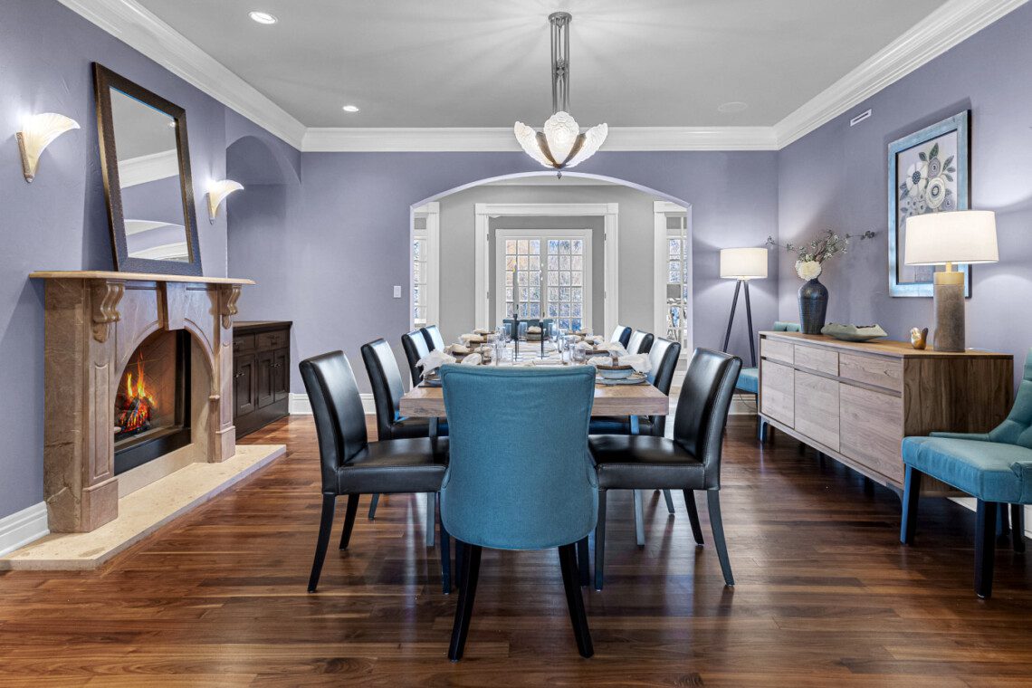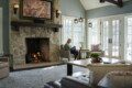 🔥 Living Room – Massive gas fireplace with a hidden TV behind printed canvas artwork, plus walk-out patio access.