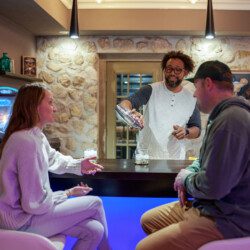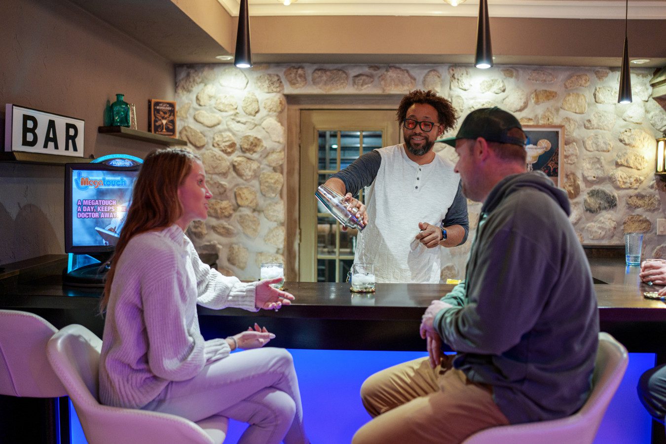 🍸 Rathskeller Bar & Lounge – Beautiful bar setup, cozy gas fireplace, and a high-end massage chair.