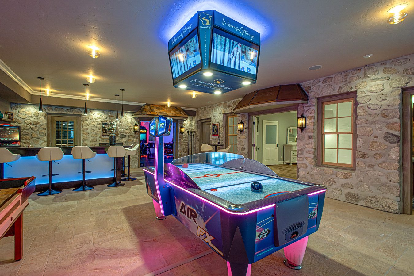 🏒 Jumbotron Air Hockey & Shuffleboard – Game night meets sports bar vibes with a 4-TV jumbotron setup.