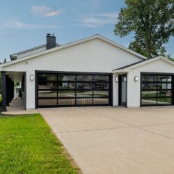 Glass garage doors that open up for an epic indoor-outdoor tailgate vibe