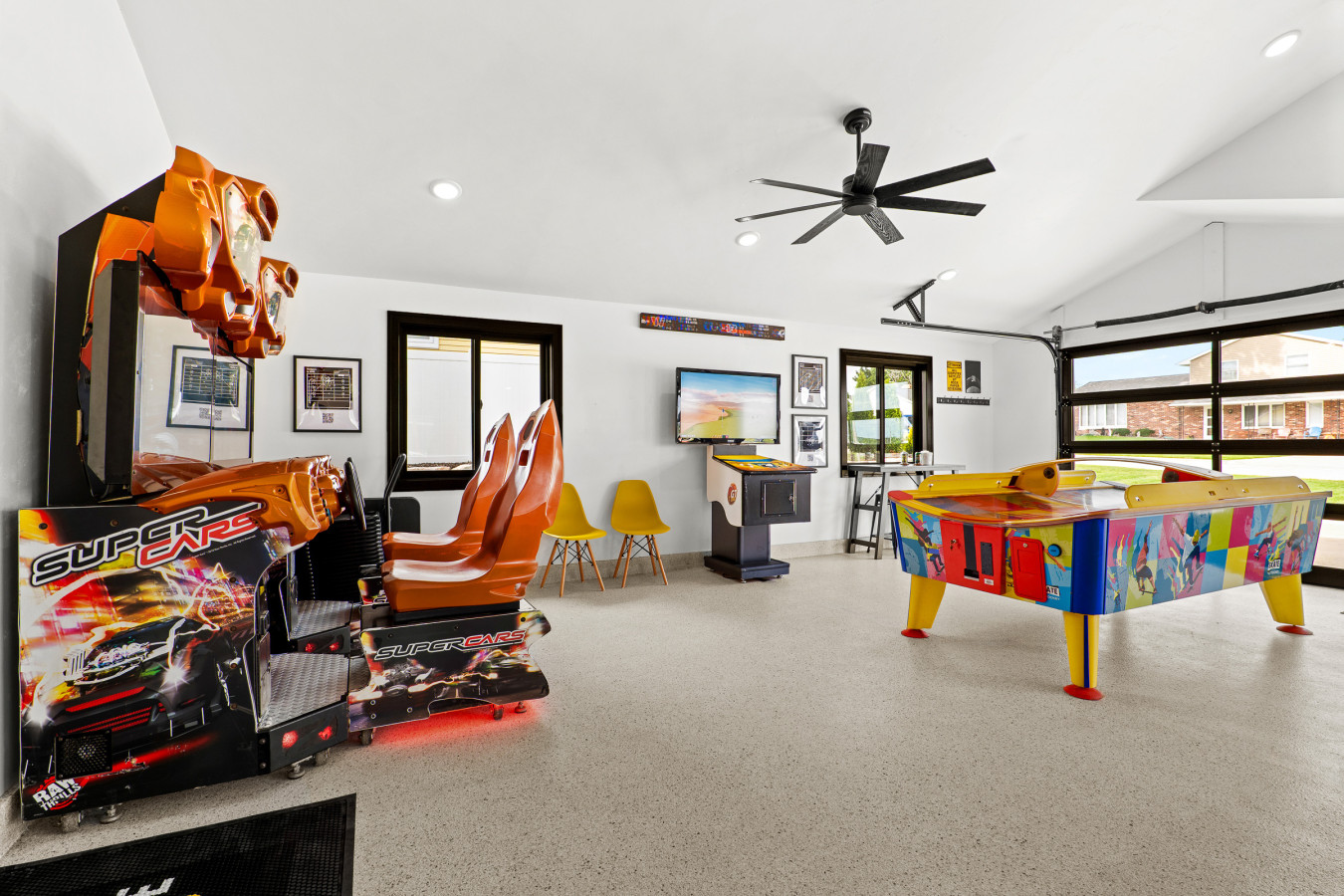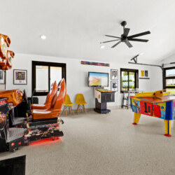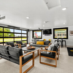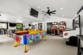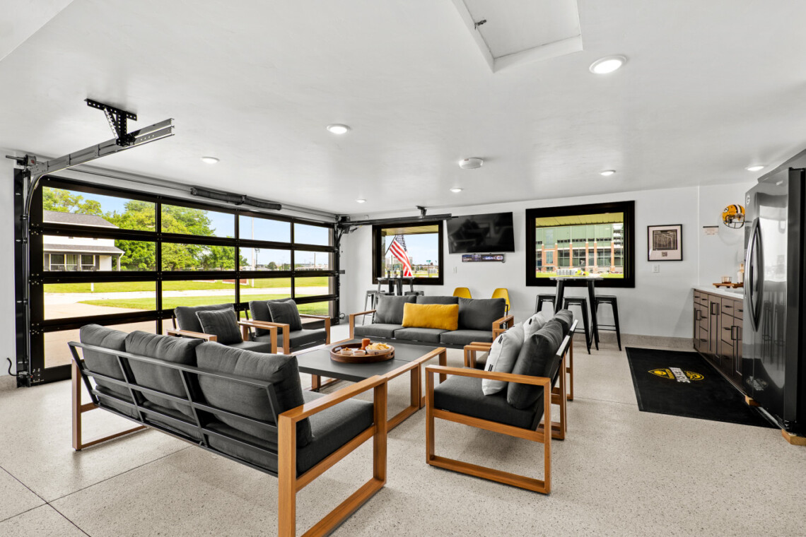 This isn’t your average garage—it’s a fully decked-out entertainment hub designed to kick off game day in style:
