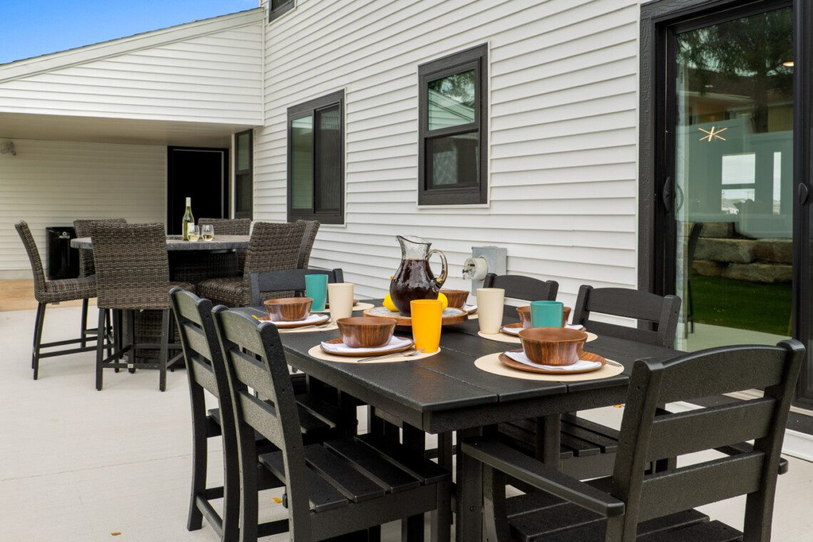 Private fenced-in patio with outdoor dining table