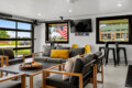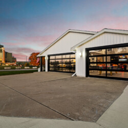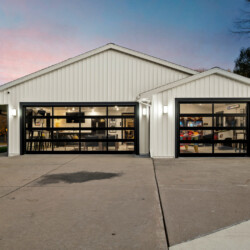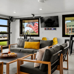 Glass garage doors that open up for an epic indoor-outdoor tailgate vibe