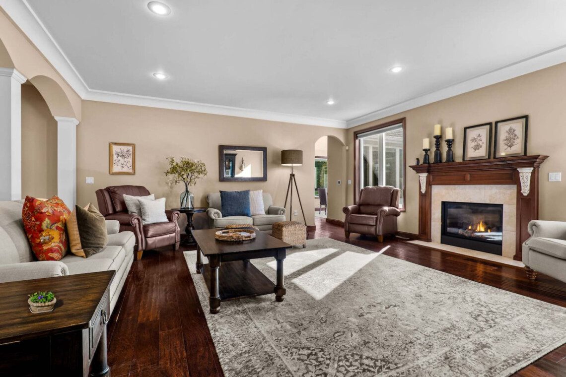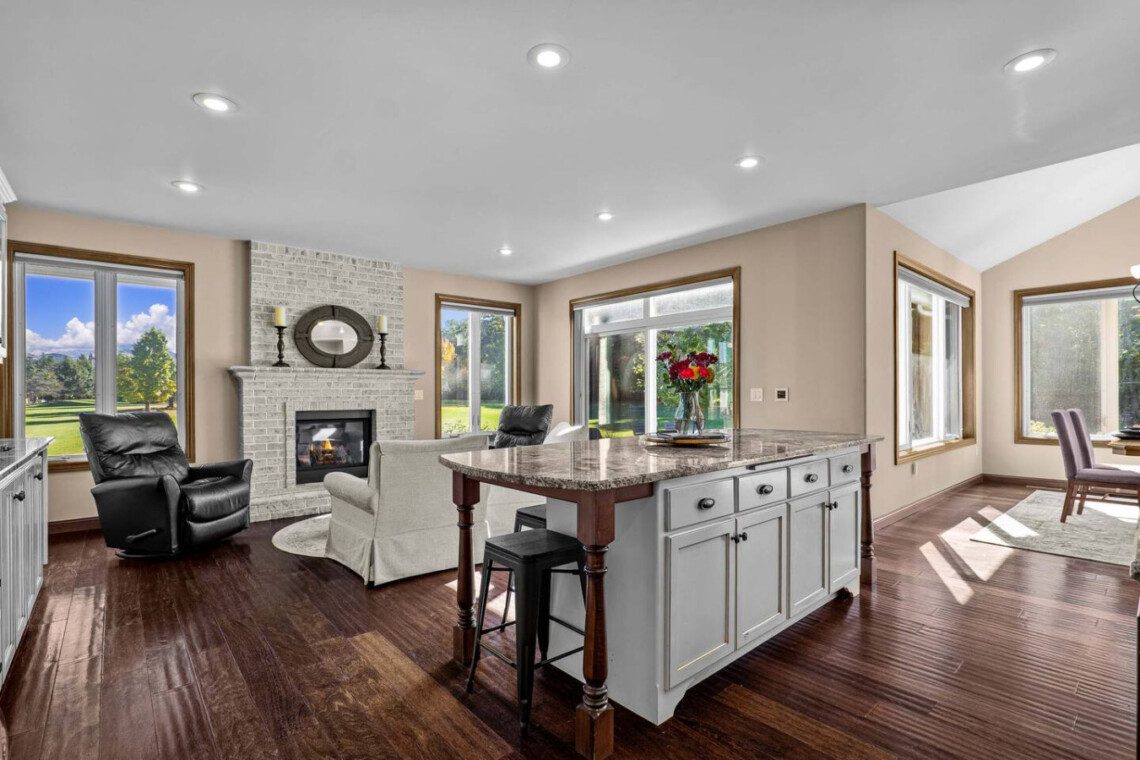 Living Spaces: Expansive open-concept layout featuring a gas fireplace and sun-filled windows.