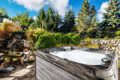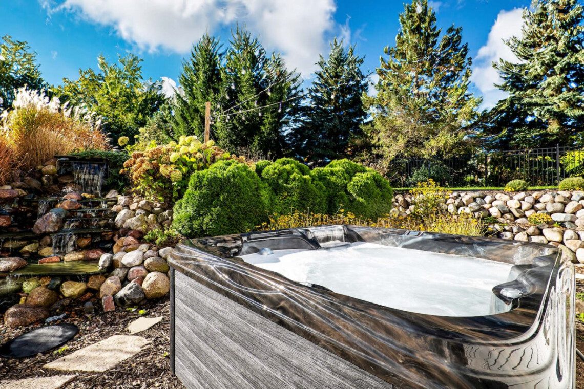 Huge Hot Tub with string lights and landscape waterfall feature ✨