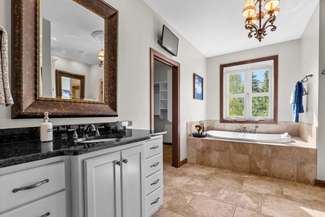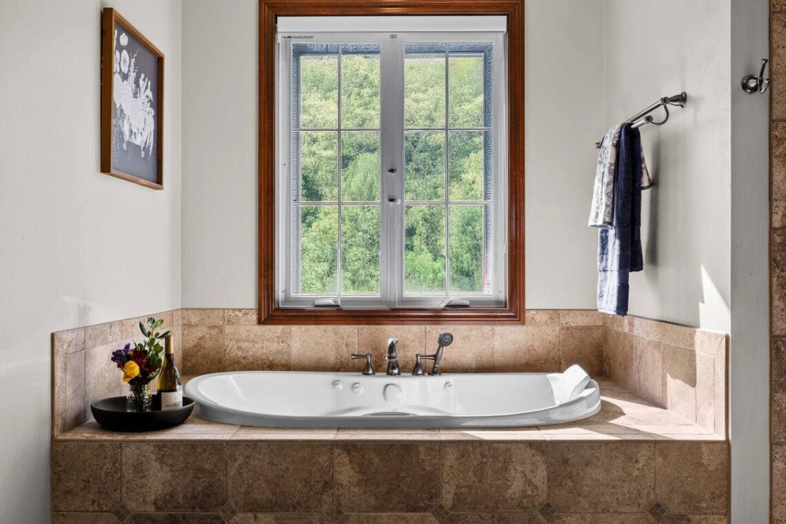 Primary Suite (#1): Queen bed with ensuite spa bath – soaking tub and walk-in tile shower.