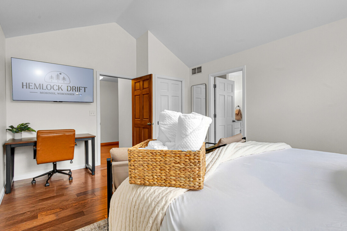 🛌 Bedroom 1: King bed, TV, workstation