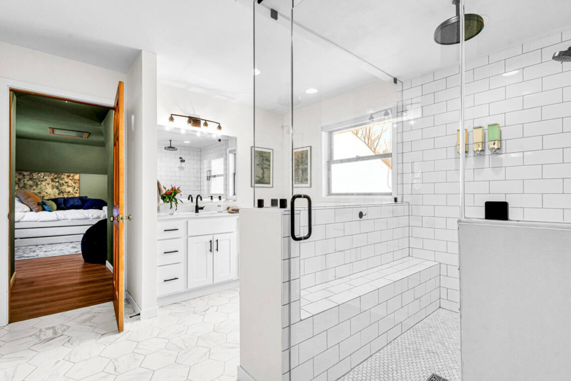 Bathroom 2: Oversized couples walk-in shower with multiple heads + rain head