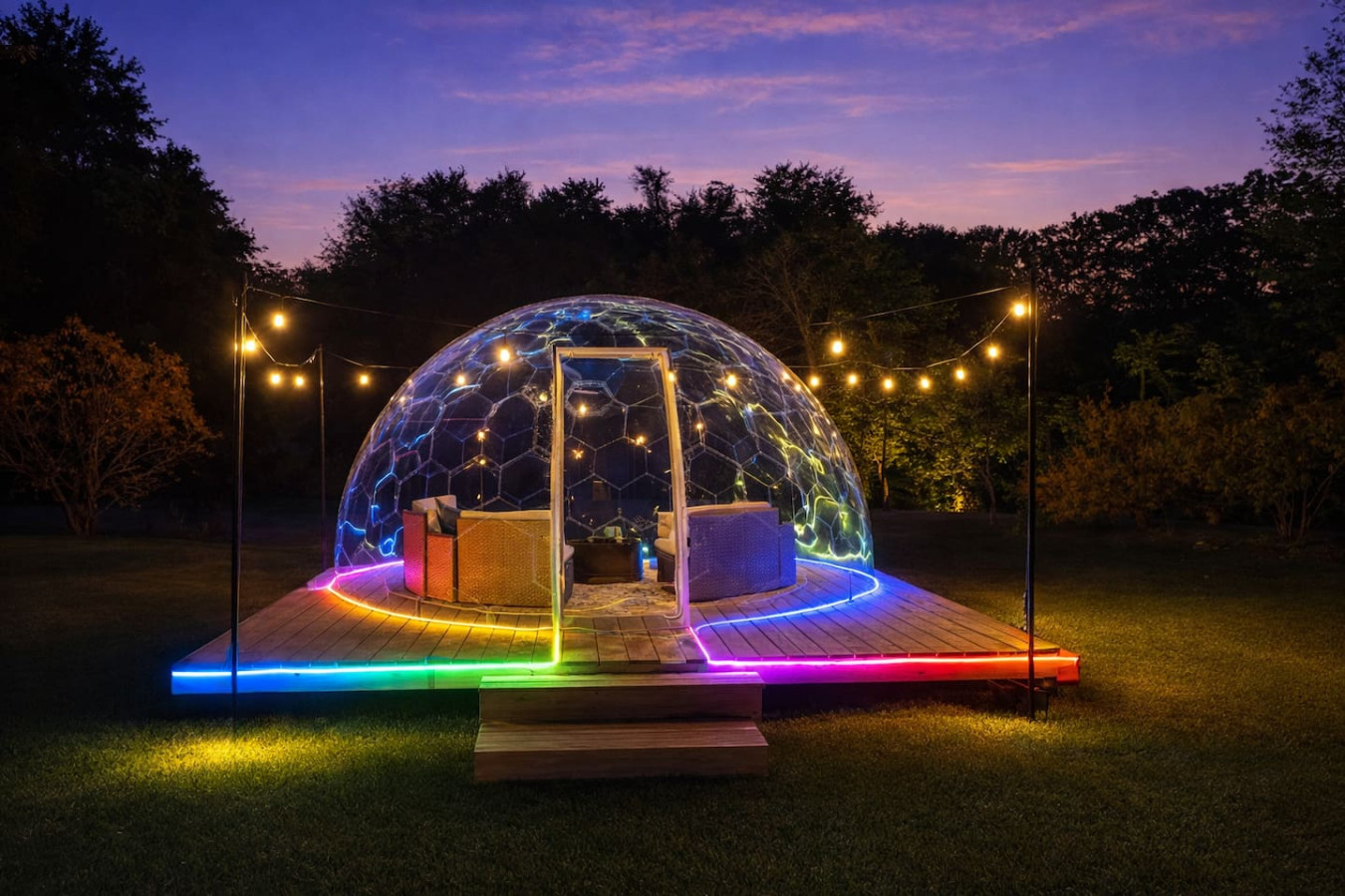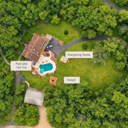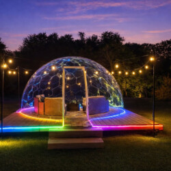 As the sun sets, gather around the firepit or step inside the incredible 15-foot stargazing dome where you can relax beneath the night sky in comfort.