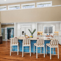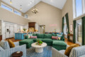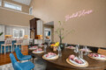 The living area flows seamlessly into a spacious dining area that comfortably seats 12 guests, along with additional seating for four at the kitchen island.