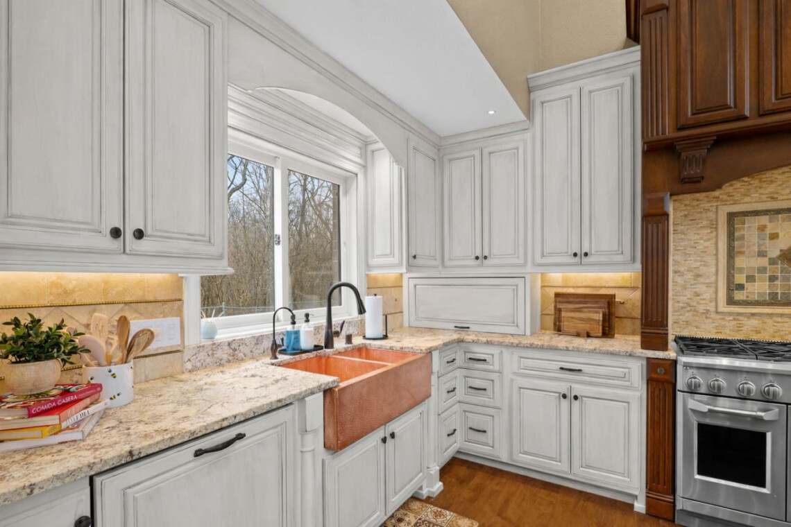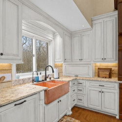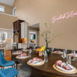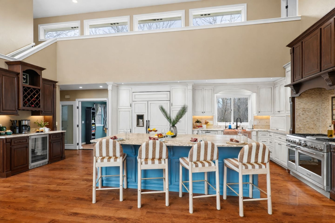 The chef’s kitchen features commercial-grade appliances, generous prep space, and everything needed to prepare meals for large groups.