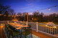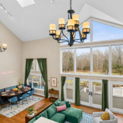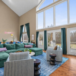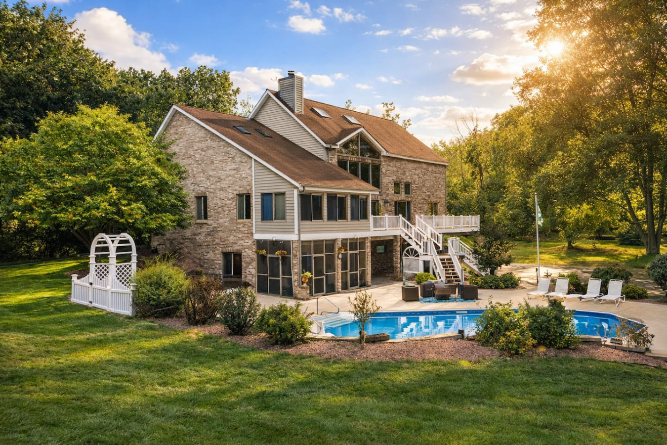 A large deck and beautiful three-season room provide comfortable gathering spaces for morning coffee, outdoor meals, and evening conversations overlooking the peaceful wooded property.