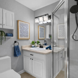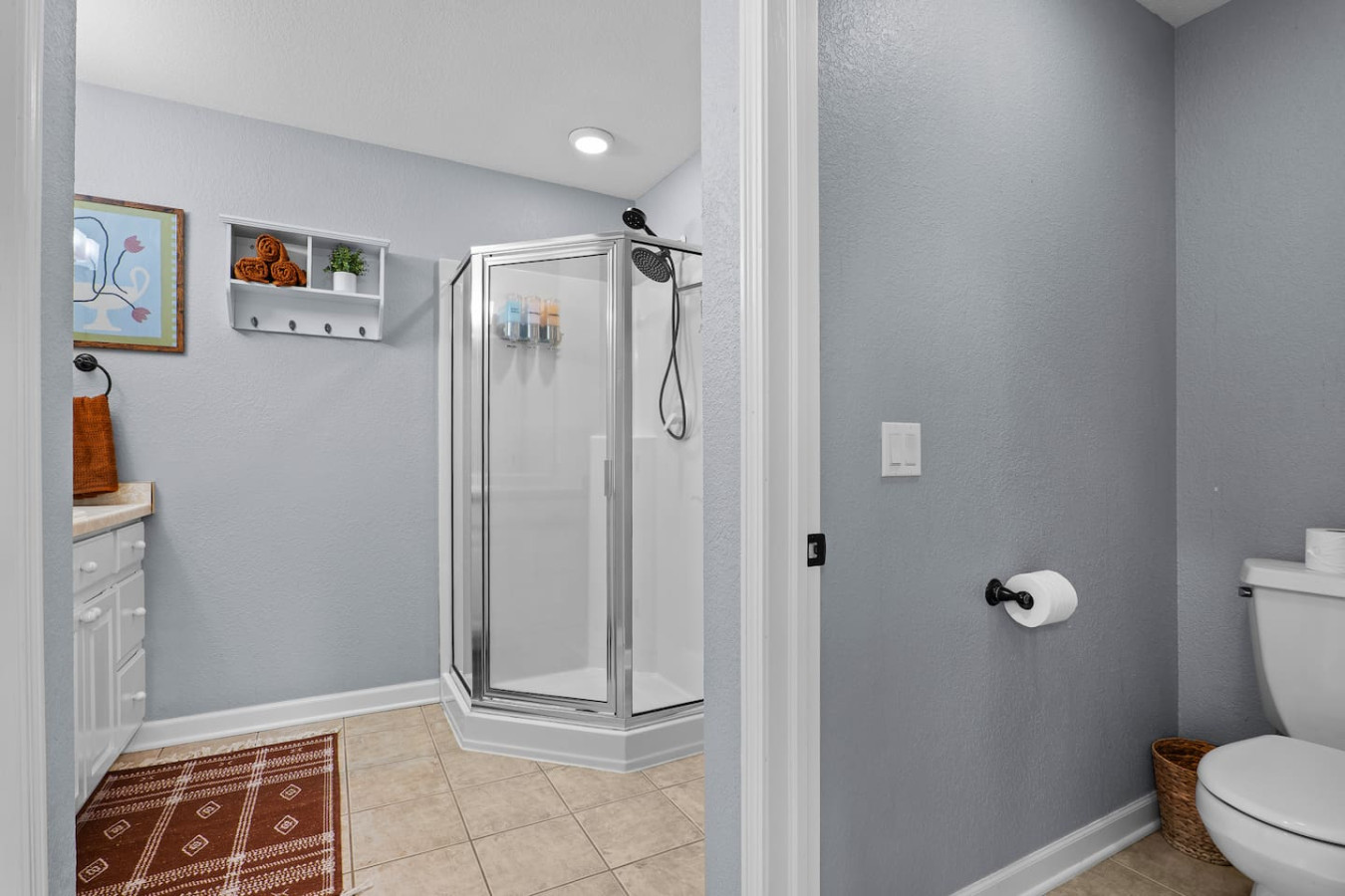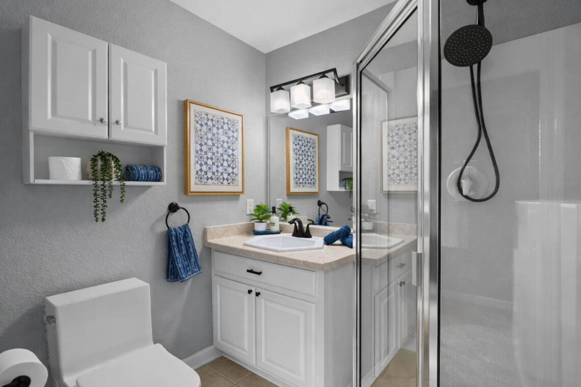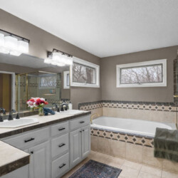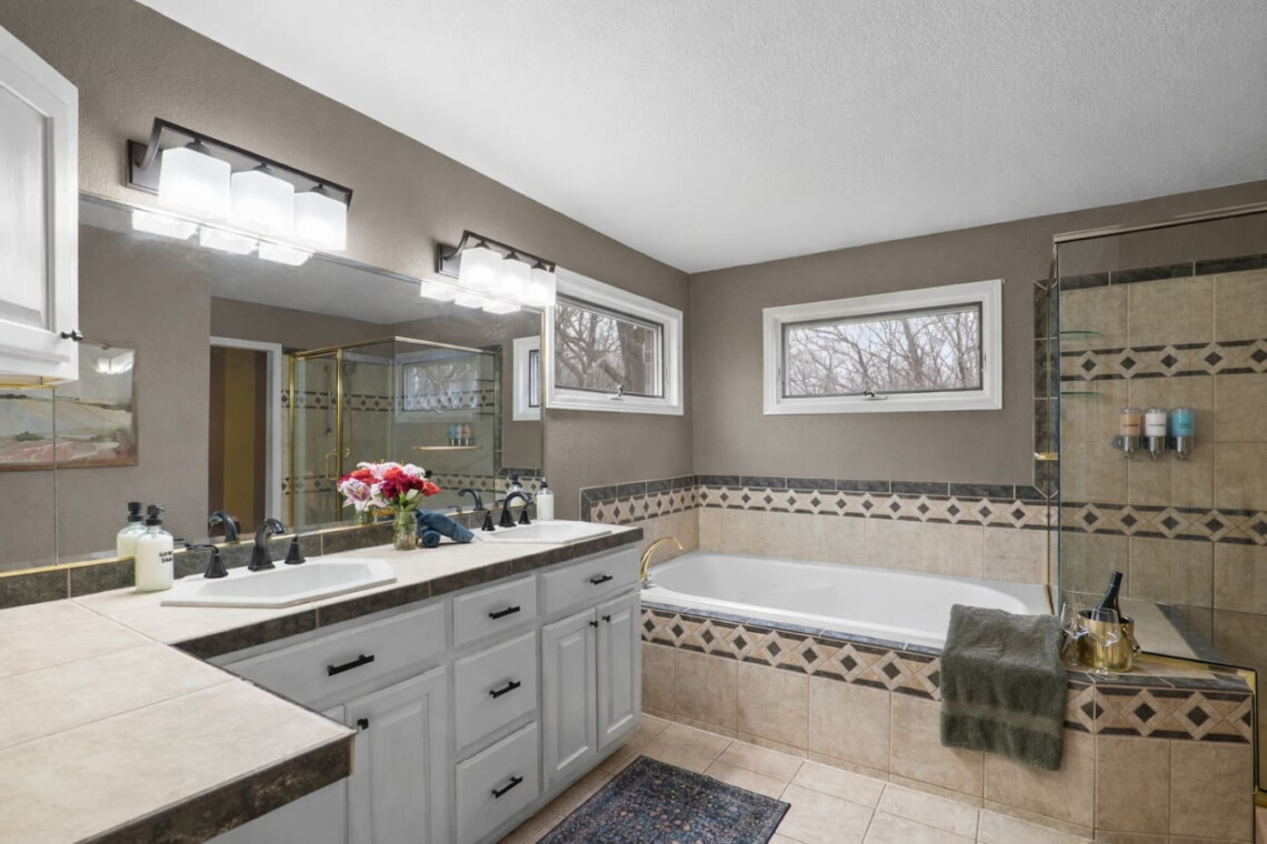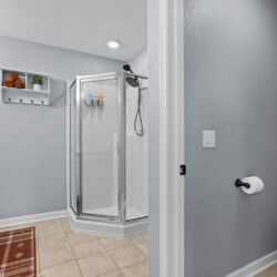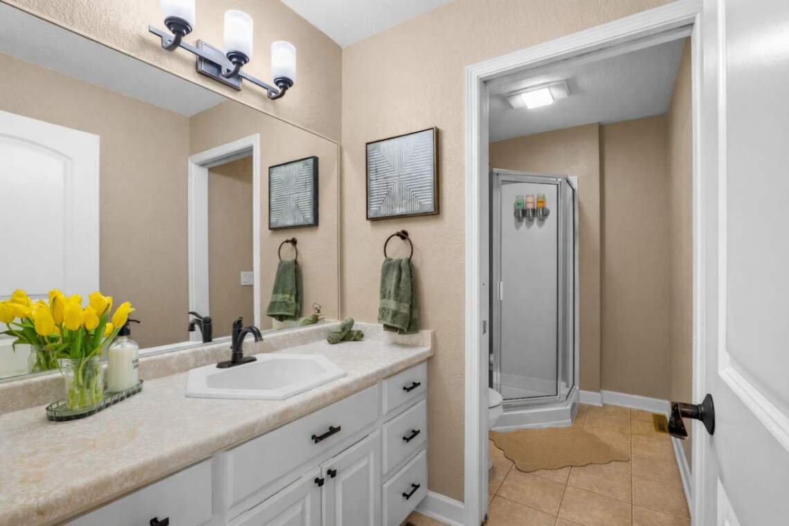 Bedrooms three and four share a full bathroom with walk-in shower.
