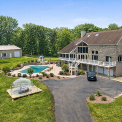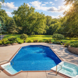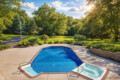 The expansive outdoor space features a stunning 36’ x 18’ pool with depths reaching up to eight feet, along with a built-in hot tub perfect for relaxing after a day on the water.