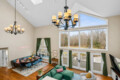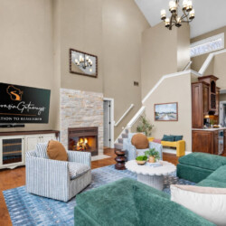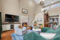Inside, the home opens into an impressive great room with soaring 30-foot ceilings, large windows, and a warm gas fireplace.