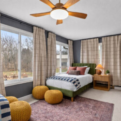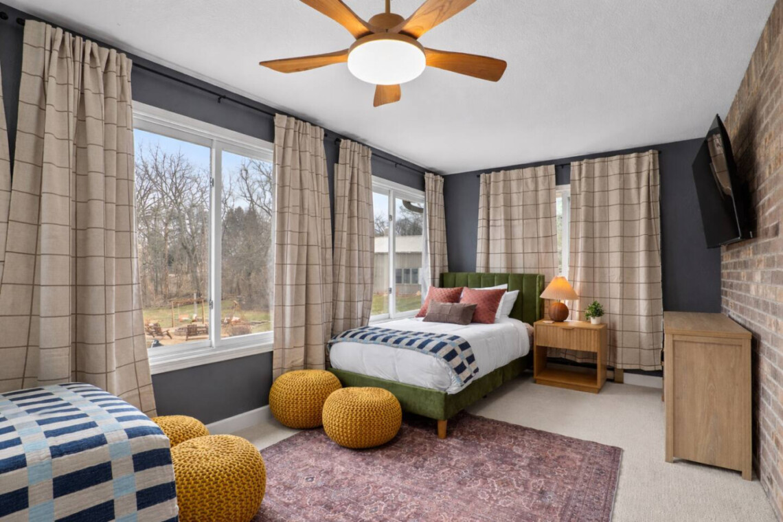 Two twin beds located near the primary suite, ideal for children.